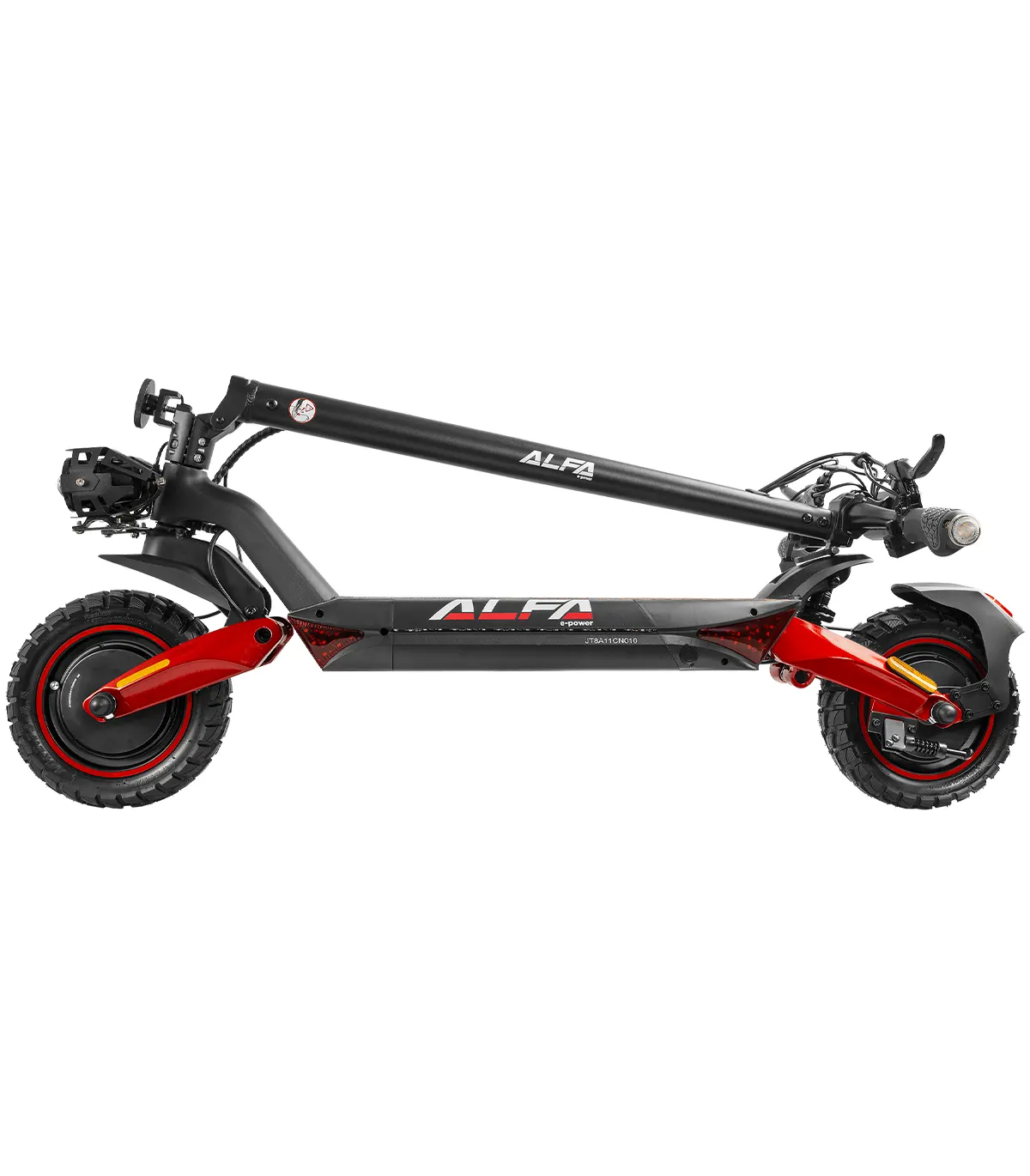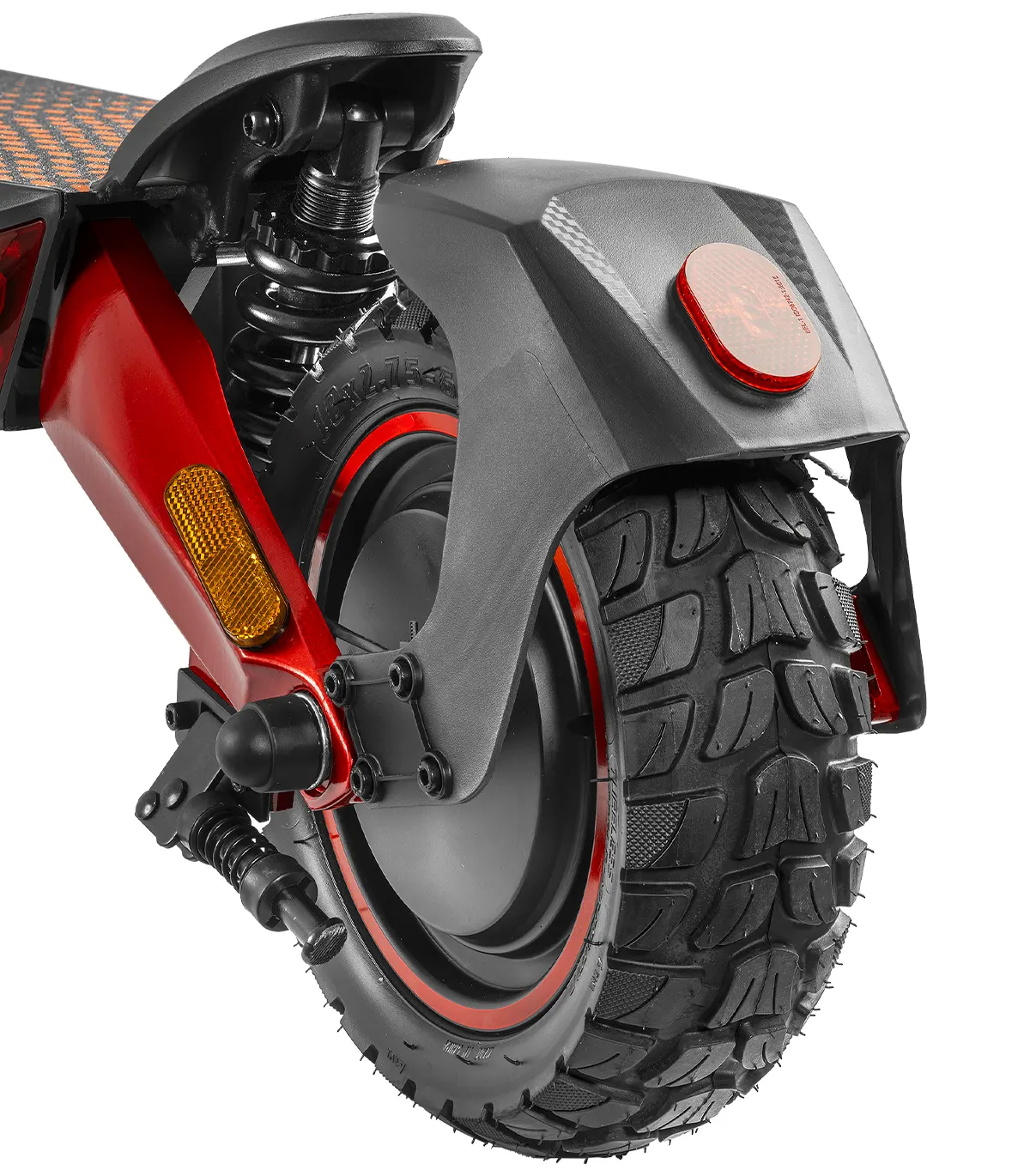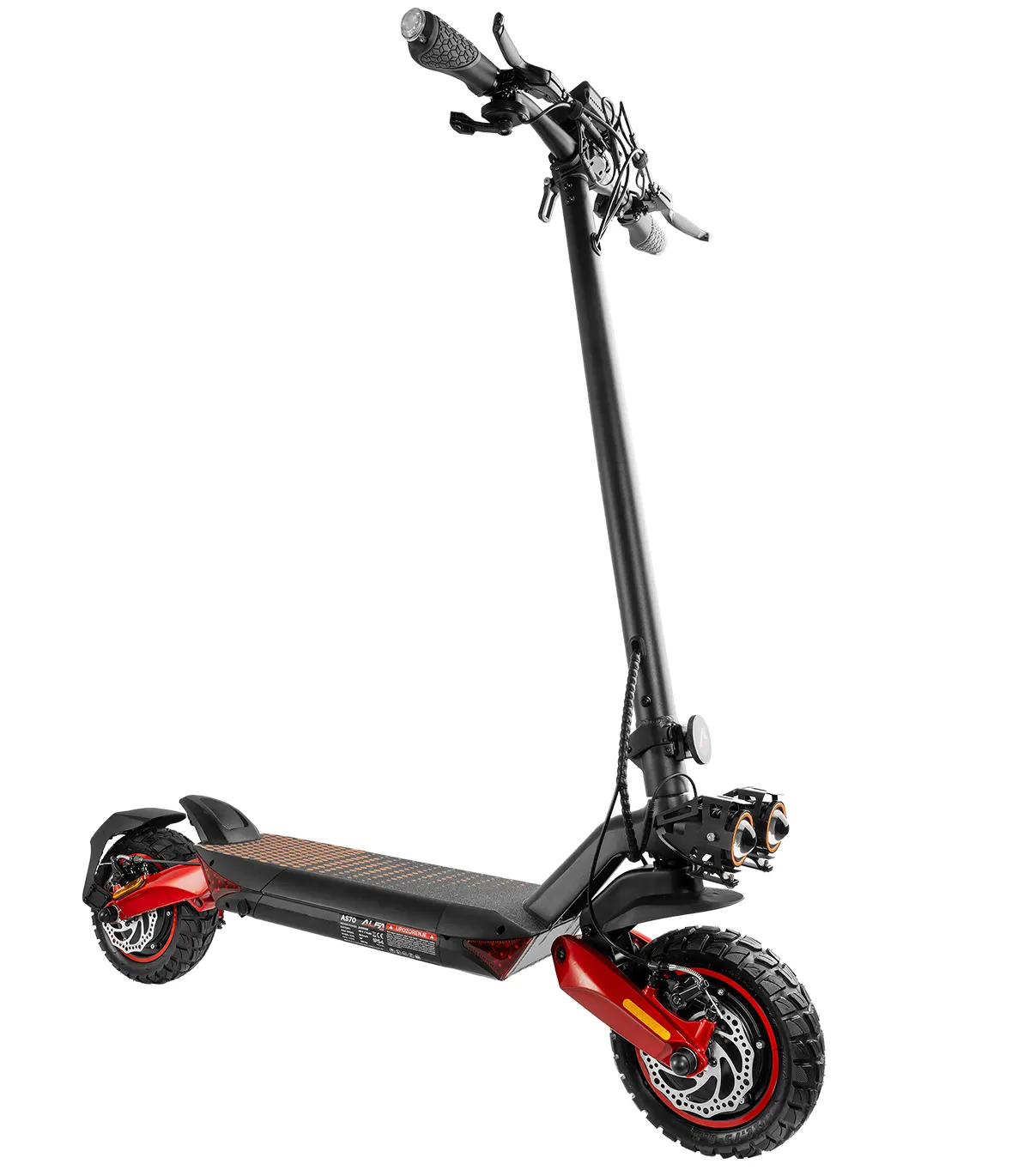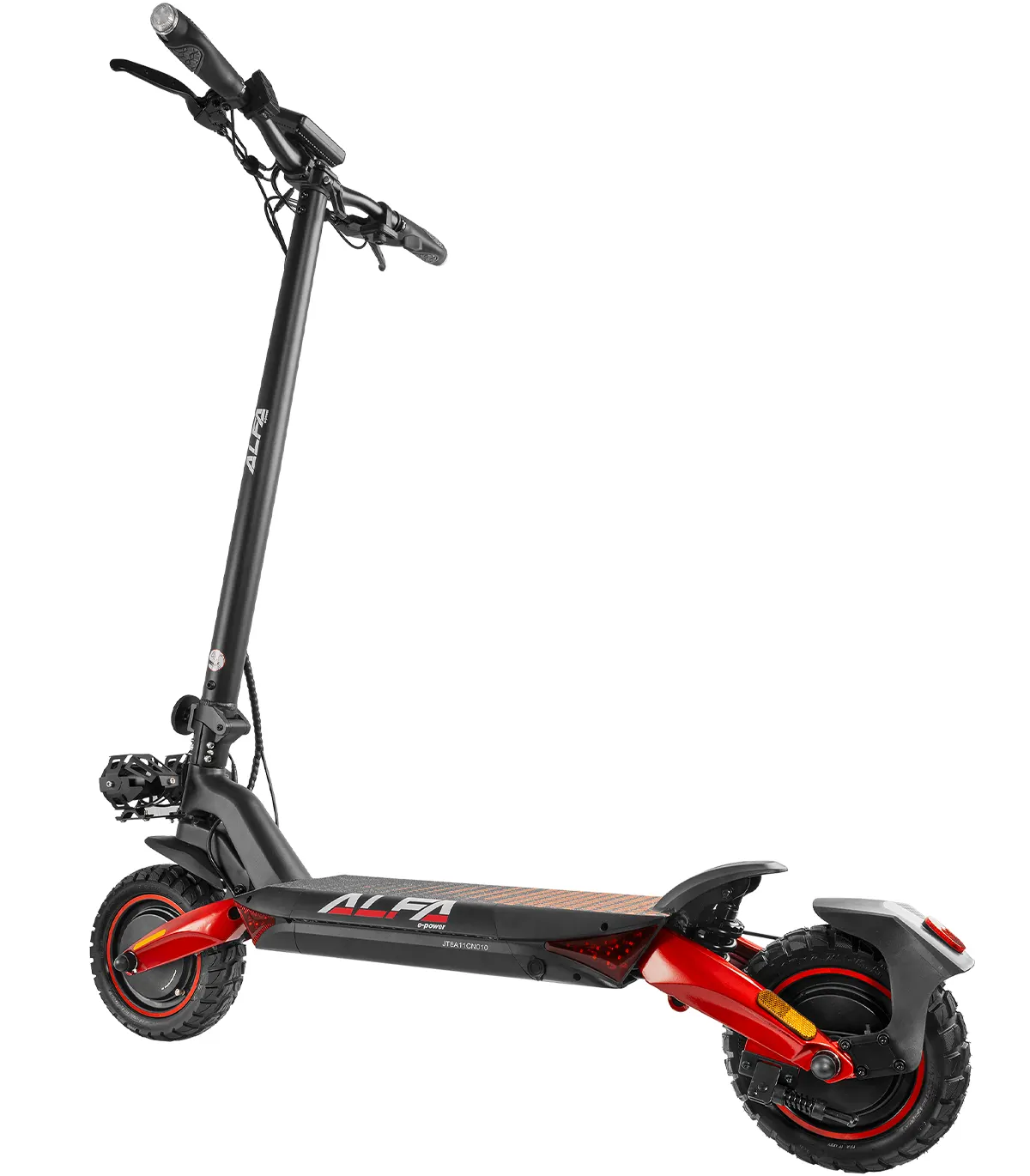 Romobil ima 10” kotače, dok prednji i stražnji amortizeri osiguravaju glatku vožnju čak i po neravnim terenima. Dizajniran je za maksimalnu težinu vozača do 120 kg, čime pruža stabilnost i izdržljivost.