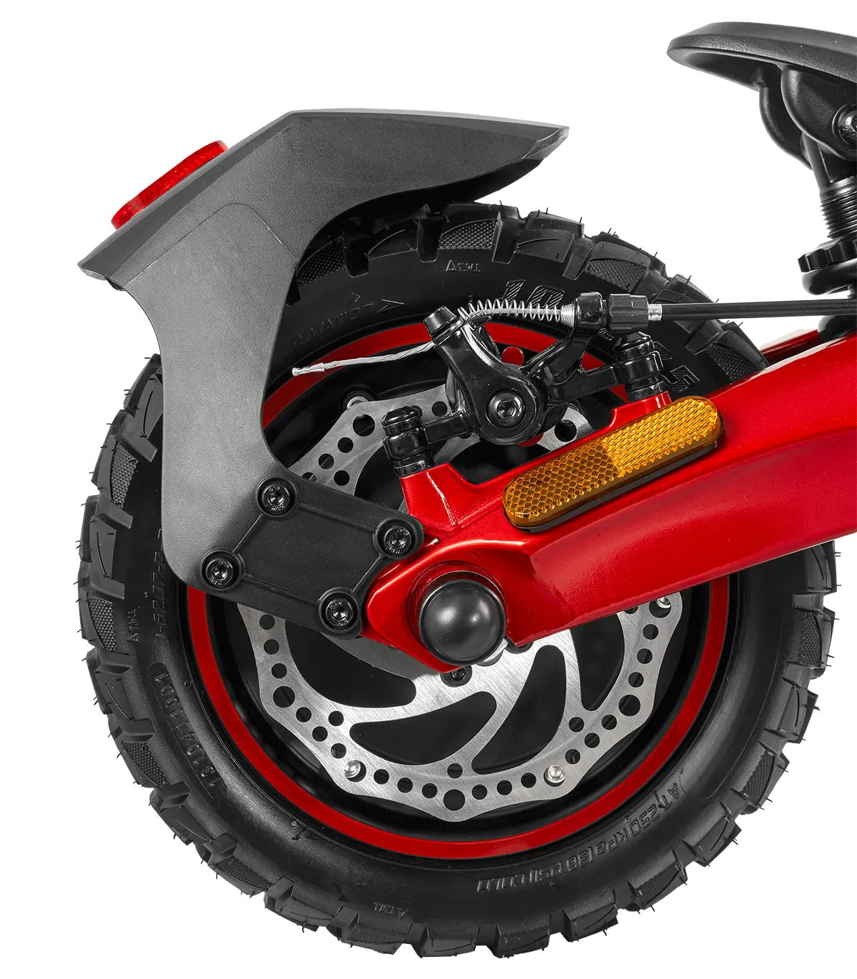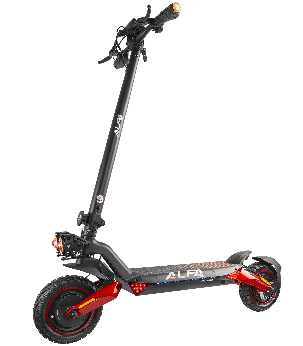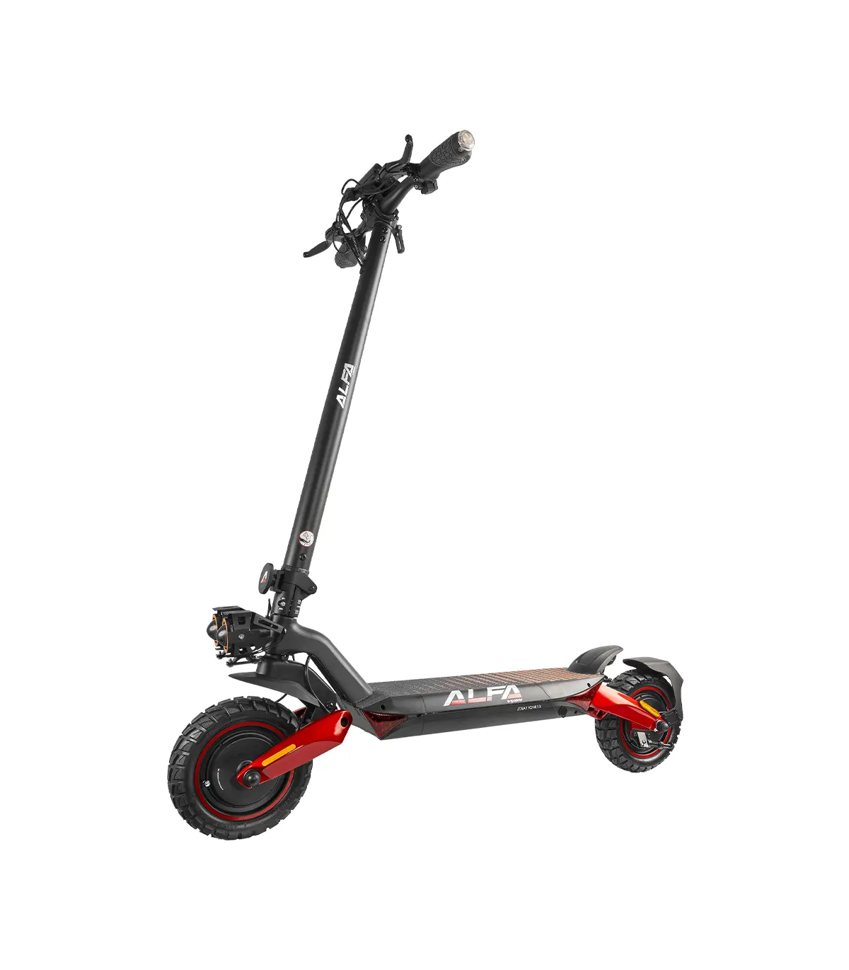 Romobil ima 10” kotače, dok prednji i stražnji amortizeri osiguravaju glatku vožnju čak i po neravnim terenima. Dizajniran je za maksimalnu težinu vozača do 120 kg, čime pruža stabilnost i izdržljivost.