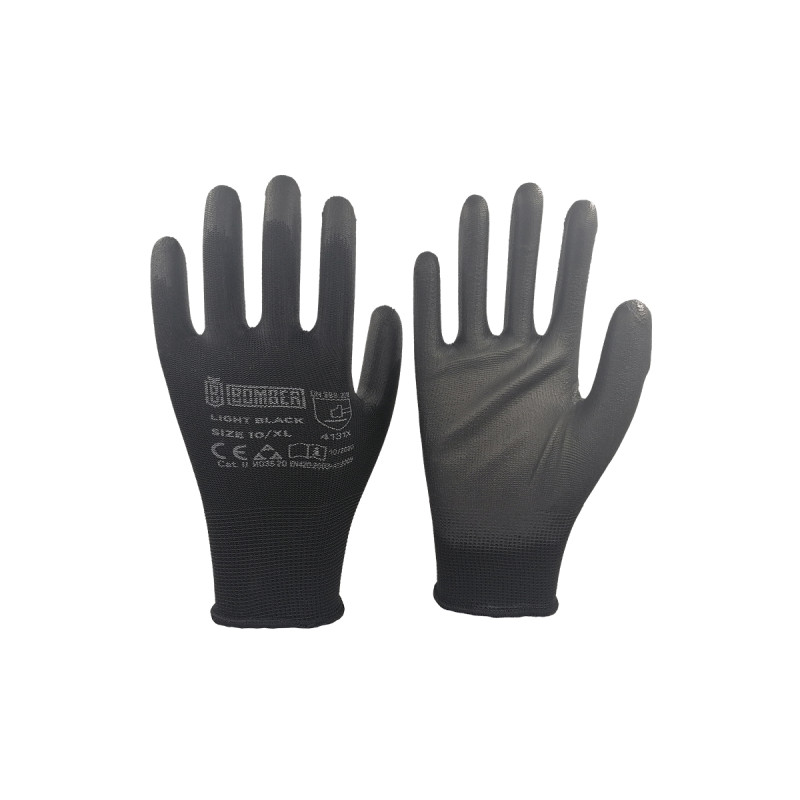 Pletene tanke rukavice od poliestera, presvučene na dlanu crnim slojem poliuretana. Elastične su i dobro prijanjaju na šake.